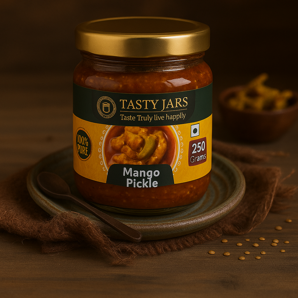 Bursting with bold Indian flavors, our mango pickle is made from handpicked raw mangoes, blended with aromatic spices and cold-pressed mustard oil. A perfect balance of sourness, heat, and nostalgia — just like homemade. Pairs perfectly with rice, roti, or paratha.