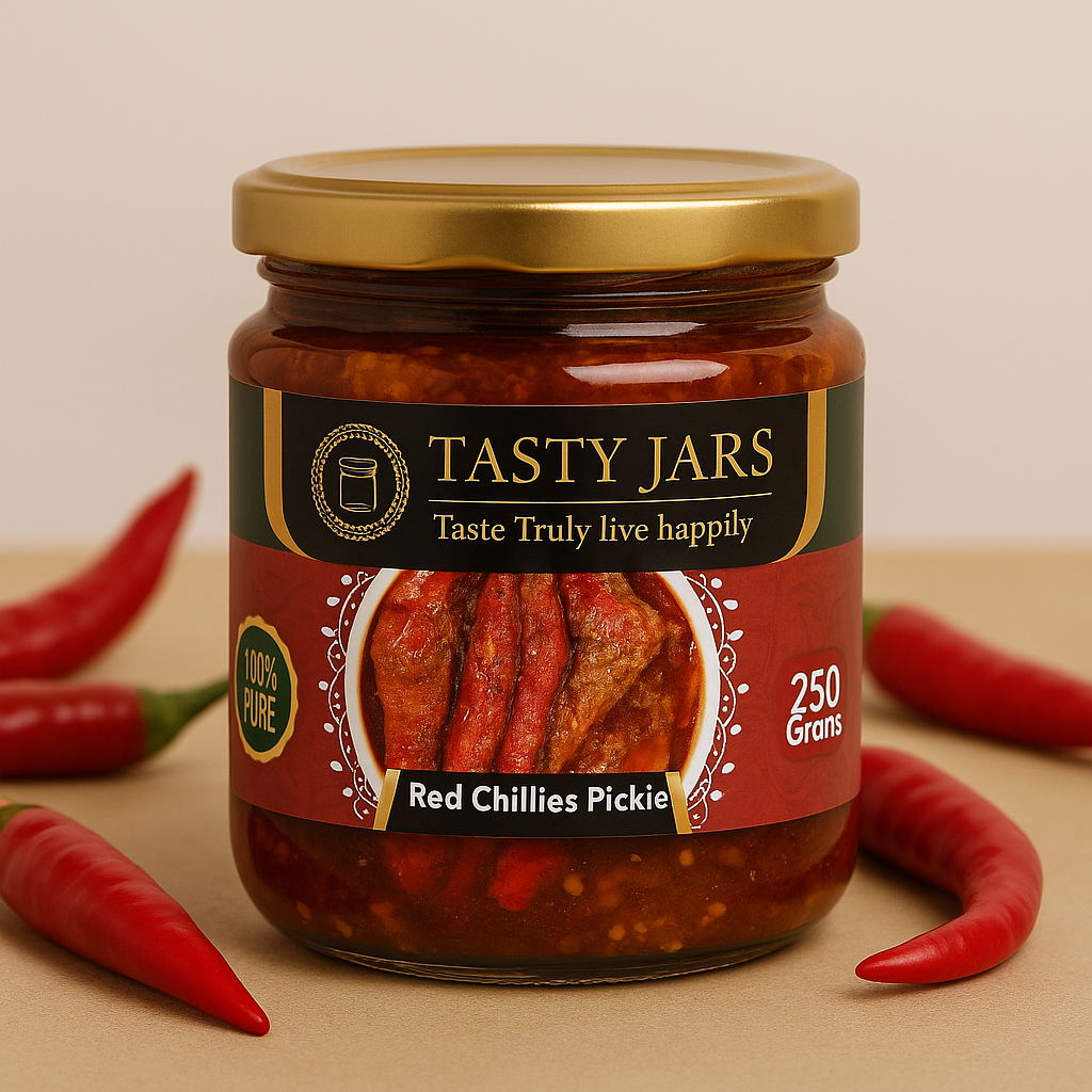 Spice up your meals with Tasty Jars Red Chillies Pickle, a fiery and flavorful condiment that embodies the bold essence of fresh red chillies. Each mason jar is packed with a vibrant mix of sliced red chillies, mustard seeds, fenugreek, and cumin, tempered in pungent mustard oil for an authentic North Indian taste. Perfect for pairing with paratha, rice, or gifting, this pickle delivers a spicy kick in a convenient, single-serve package, ideal for enhancing any dish.